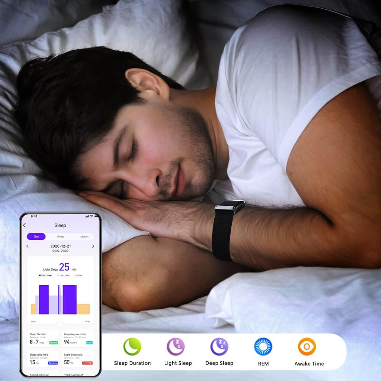 Suivi de santé 24h/24 et 7j/7 : fréquence cardiaque, SpO₂, stress, HRV et analyse du sommeil.